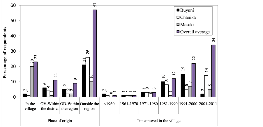 Rural urban migration is one of the primary drivers of land cover/use dynamics in peri- urban areas and adjoining environment. According to Muzzini and Lindeboom (2008) Rural-to-urban migration is the “natural” direction of geographical mobility, as economic growth induces a spatial shift in the distribution of economic activities in favor of urban centers, freeing up manpower that can be utilized by the urban economies. However, a multitude of factors are described in literature as push factors for rural-urban migration in sub-Saharan Africa. The factors include rural poverty and lack of basic infrastructures and social services such as roads, water supply, access to markets, health and education. Rural poverty in Tanzania is influenced by low productivity in agriculture and youth unemployment which is attributed among others by lack of skills, training and credit facilities. These problems affect youths in rural areas, particularly those who have just completed primary education resorting to urban migration. The perception for majority of unemployed rural population is to improve their living standards through migration to urban areas. Migrants to urban areas also anticipate enjoying better social services and economic opportunities. As result, rural-urban migration significantly contributed to the dramatic population growth of Dar es Salaam over the last four decades (Kombe, 2010) . In the last three decades the city sustained high annual population growth rates ranging between 4.5 and 8 percent (Kombe, 2010) . The city population doubled between 1978 and 1988 and between 1988 and 2002. It is estimated that on average 16% of the city population is migrants (Kebede & Nicholls, 2011) . The growth of population for Dar es Salaam City is directly related to population growth in its peri-urban areas. Between 1978 and 1988 the population in the study peri- urban areas increased thrice in Pugu (Stesheni and Kajiungeni), nine times in Chanika, and two times in Buyuni and Kisarawe. The 1988 population was doubled in 2002 for all of these peri-urban areas. With the exception of Kisarawe, the 2012 projected population has also doubled since 2002. Analysis of the origin of population in Buyuni, Chanika and Masaki revealed that 57% of the sample population originated outside from Dar es Salaam and Coast Region. The population originating from Dar es Salaam and Coast regions represented only 9% while those originating within Ilala and Kisarawe districts represented 11%. The population native in the study peri-urban areas of Buyuni and Chanika represented two and one percent respectively. This implies that for every 100 households there are only two households which are native to Chanika and one household which is native to Buyuni (Figure 2). Also the analysis reveals that the size of immigrant population decreases as the distance increase from the peri-urban to the rural areas in Kisarawe. For example, Masaki village which is located about 15 km from Kisarawe town had 20% of respondents who are native to the village compared to 2% and 1% for Buyuni and Chanika respectively.