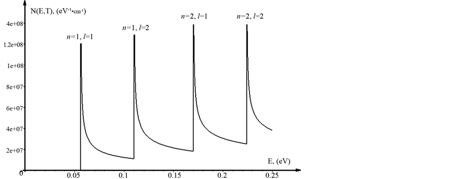 Figure 1. Dependence of density of states of 1D electron gas of energy L1 = 10−8 and L2 = 1.5 ´ 10−8.