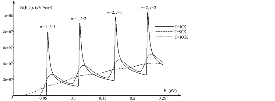 Figure 2 shows plots of the density of states of one-dimensional electron gas. We analyze the results of numerical calculations. The figure shows with solid lines the density of states graphics calculated at T = 10 K. This schedule is almost the same as in Figure 1, which does not take into account the temperature dependence of the density of states. However, the temperature difference between the zero lead to the fact that the height of the peaks in Figure 2 are reduced about 1.5 times. An increase in temperature greatly reduces the height of the peaks, the discrete quantization levels cross a two-dimensional quantum well. A further increase in temperature to T = 90 K, more blurs the peaks turning them into low humps of the density of states. At a temperature T = 300 K, the density of states in one-dimensional gas becomes a monotonically increasing function of energy where the discrete levels are almost invisible.