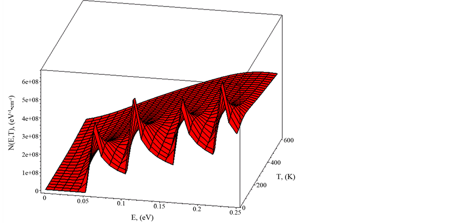 Figure 3. Dependence of density of states of 1D electron gas on the energy and temperature in three- dimensional space: L1 = 10−8 m and L2 = 1.5・10−8 m.