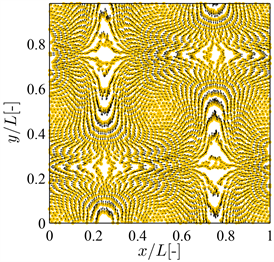 Without treatment the interface becomes unstable soon after the start of a simulation, which is revealed by the clustering of particles (Figure 5(b)). With particle collisions the interface remains stable for a time scale that is at least one order of magnitude larger (Figure 5(c)). From other simulations it is concluded that the interface becomes slightly more unstable with increasing wave speed ratio, as may be expected. However, it still remains intact, even at an (unrealistic) high wave speed ratio of 20. Note that in reality, like in our simulations, the wave speed ratio of water and air is about 4 ( m/s and m/s at 20˚C).