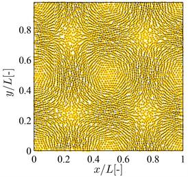 We use air particles with m/s, and in the equation of state (26). The domain size is m and the velocity amplitude m/s―so that ―which are the same values as used by Hu and Adams [36]. The above solution for the velocity and pressure field at is used as initial condition in the SPH simulations. Figure 1 shows the initial condition on a grid, so that the initial velocity field is clearly visible.