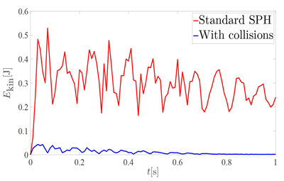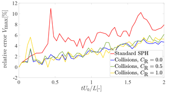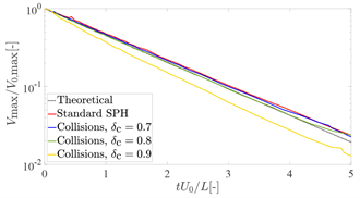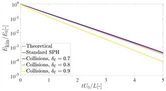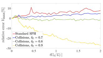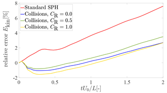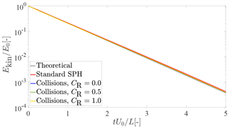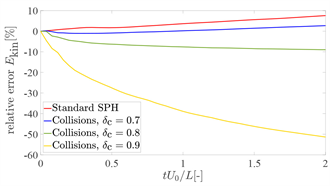 In this work the particle collision concept is applied within weakly compressible SPH; in principle it can also be applied in incompressible SPH. Artificial viscosity has effects similar to a subgrade scale turbulence model [45]. Turbulence is modelled by a smoothed velocity at the scale of the smoothing length [46]. The particle collision model does not rely on a smoothing kernel, so that effectively a (small scale) hat function is used. More investigation is needed in how far turbulent viscosity is or may be represented by the time and space dependent viscosity introduced by inelastic collisions. Also, more investigation is needed in how far the particle collision concept may be used without any dissipation of energy, for example by changing the particle positions due to collisions, but not their velocities.