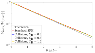 In Figure 4 the effect of the restitution coefficient on the decay of kinetic energy and maximum velocity is shown, while the collision distance factor is kept constant at . Here, in all cases the decay of kinetic energy agrees well with theory, while the maximum velocity is slightly overestimated. Also here standard SPH shows a peak value in the relative error (Figure 4(d)), which does not appear with particle collisions. The relative errors are significantly reduced for all CR-values. The relative error in the maximal velocity (up to 4%) is slightly higher than that in the results of Hu and Adams [35](up to 3%) at the same resolution. The latter results are obtained with ISPH, where a reference or background pressure is used, which is superimposed on the pressure to avoid stability problems due to negative pressures.