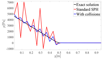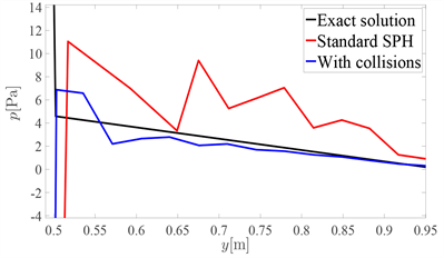 Figure 6 shows the pressure distribution for the simulations in Figure 5. Without interface treatment, the pressure is fluctuating heavily around the physically correct pressure. With the collision concept, the pressures are much closer to the (initial) linear pressure distribution. In Figure 7 the results of a stability analysis are shown, where the evolution of total potential and kinetic energy of the water-air system is plotted in time. With standard SPH the potential energy immediately drops after the start of the simulation. Potential energy is converted into kinetic energy, indicating that the particles are moving and they keep moving. With particle collisions the initial drop of potential energy is much smaller and coupled with a slight increase of kinetic energy. This results in a slight move of the particles until the collisions prevent any further movement. The total kinetic energy then returns to zero.