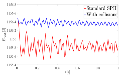 Figure 7. Stagnant flow in a reservoir. Stability analysis with the evolution of total potential and kinetic energy of the water-air system in time. Comparison of standard SPH and the particle collision model. (a) Potential energy; (b) Kinetic energy.