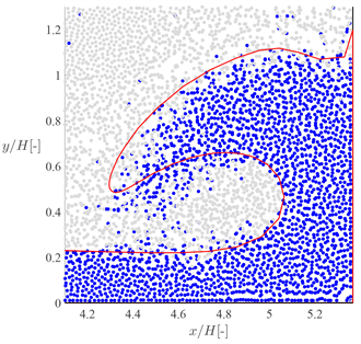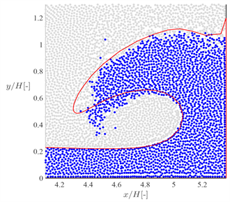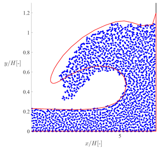 Figure 8 shows the flow at . The water particles are depicted in blue, the air particles in grey. The red lines, shown in all panels, give the BEM solution given in [41]. Figure 8(a) shows the single-fluid simulation of Antuono et al. [41]without extra diffusive terms, to allow for a more honest comparison with our results. The simulation with standard SPH (Figure 8(b)) captures the free surface contour reasonably well. Note that we did not use any remedies, like diffusive terms, density re-initialisation, artificial viscosity terms, XSPH correction, control of interface sharpness or adapted state equations, as used by other researchers (e.g., Colagrossi and Landrini [37]), neither did we use a high-order time stepping scheme. Therefore the particle distribution itself is also very noisy. However, with collisions ( and , Figure 8(c)) the shape of the wave is captured quite well. Increasing the restitution to increases the dynamics, which has a negative effect on the particle distribution and leads to results similar to those without collisions. A larger collision distance keeps particles closer together, but also makes the flow a bit more viscous (Figure 8(d)).