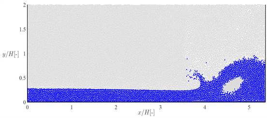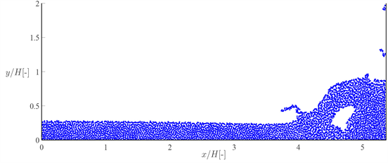 The two-dimensional dam break is a classical SPH benchmark case (e.g. [3][37][38][39][40]), which is usually simulated as a single phase flow. Here, we consider a multi-fluid dam break with a density ratio of 1000:1. The setup is as in [37][41], but with air particles surrounding the water. The domain boundary consists of ghost particles which have a constant density equal to the initial density of the water particles. The initial particle spacing is chosen such that we have approximately the same number of water particles as Antuono et al. [41]. In total we have over 38,200 particles. The wave speeds for water and air are 60 and 15 m/s, respectively.