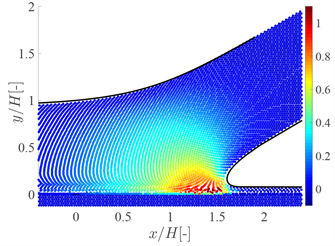 The second term in the y-coordinate of the free surface contour vanishes far from the impingement ( , ), where the height of the left and right branches is constant, as described by the first term. Here the magnitude of the flow velocity is the same as the jet velocity.
