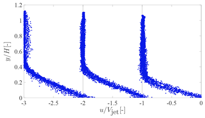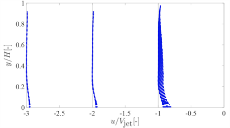 Next, we aim for no-slip wall conditions. In this case the viscosity of the ghost particles is equal to that of the fluid particles ( Ns/m2). With standard SPH this can only be achieved by increasing the fluid viscosity to high, artificial values, resulting in low Reynolds numbers and parabolic velocity profiles, typically valid for laminar flows. With the particle collision model however, this can be achieved at a real viscosity―in this case of water―allowing for much higher Reynolds numbers. In Figure 11 the results of an SPH simulation with particle collisions are shown at ( m/s). Due to the no-slip condition a boundary layer arises, so that the particle distribution now slightly deviates from the free-surface contours. At this Reynolds number, the velocity profiles (Figure 11(b)) are no longer parabolic. This is revealed by the presence of a finite and distinct boundary layer, also seen in turbulent flows. With particle collisions it is thus not necessary to increase the viscosity to high artificial values. The no-slip wall condition is satisfied at the real viscosity Ns/m2 of water, even at a high jet velocity.