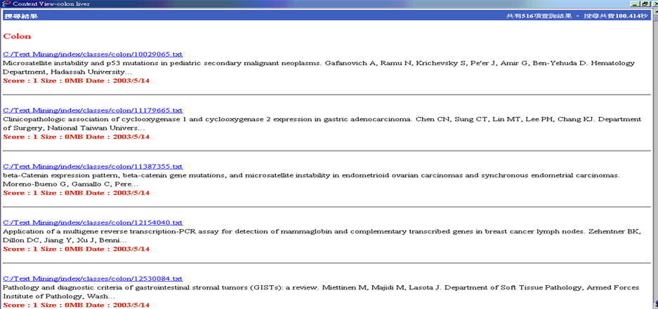 Figure 6 shows 516 documents, clustered according to the term colon and liver, whereas Figure 7 shows the effectiveness of all categories.