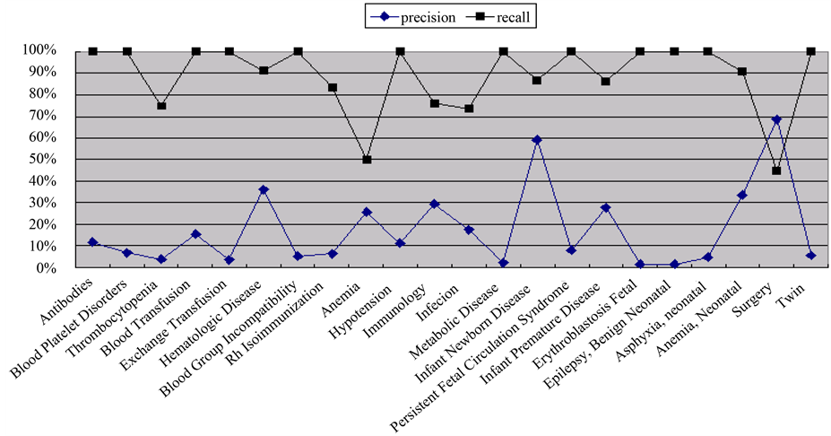 Five hundred sixteen (516) documents were clustered into a category in accordance with a maximal connected component generated from two terms colon and liver (Figure 6). This study allows documents to be soft categorized into several clusters due to their overlapped themes, which is producedby the commonly co-occurring terms associations. The MeSH categories (22 categories) were used to evaluate the effectiveness of SCA (Figure 7) on each category of the fourth dataset. The document clustering is based on the MeSH terms related to transfusion and pediatrics. The MeSH categories are a hierarchical structure that some categories are the subcategories of the other categories. Many theme categories shared the same terminology that induces a high false negative rate by SCA on document clustering. In the dataset documents are not uniformly distributed in all categories, some categories only contain a few documents that make their latent themes restricted by a few terms, for example, the anemia and the surgery categories whose precision are both below 70%.