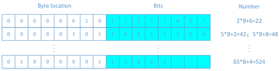 The image acquisition module sends out all the packets at one time and waits for the Feedback Report. After receiving the Feedback Report, it resends the packets not received by the base station according to the feedback situation. At the base station, the receiver knows the total number of packets N according to the first packet, and establishes the Registration Table composed of (N/8 + 1) bytes. Here, each byte is called a Table Item, and each bit in a Table Item is called a Registration Bit. Each bit corresponds to the receiving state of a packet. The Registration Table structure is shown in Figure 10.