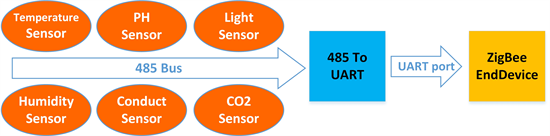 The environmental parameter acquisition subsystem is responsible for collecting temperature, humidity, light intensity, pH value, conductivity and CO2 concentration information in the growth environment of agricultural products. The structure is shown in Figure 3. All sensors are connected to a 485 bus and then connected to CC2530 via a chip of 485 to serial port. The sensor data are controlled by CC2530 and then sent to the regional gateway via the ZigBee protocol.