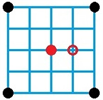 The 4 black points represent 4 co-frequency cells with the shortest distance of 4, and the red point represents the neighborhood with the adjacent frequency of the black point. It can be seen that the average effect on black points is the least when red points are placed in the middle of four black points. However, since there are two adjacent frequency cells for each cell (one’s frequency is higher while the other’s is lower), if one is placed in the center and the other can only be placed near the center.