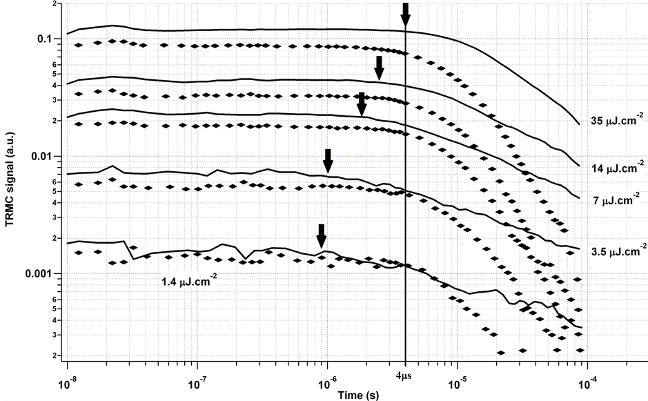 Figure 1. TRMC signals induced by 532 nm laser pulses (10 ns FWHM) in pieces of a p-Si wafer covered at one side with Al2O3 deposited by spin coating (diamonds) and by spray pyrolysis (line) in a double logarithmic representation. The samples are illuminated at the Al2O3 covered side with laser intensities as indicated in the figure. The onsets are indicated: Black bold line at 4 μs for the SC coating and black arrows for the ILGAR coating.