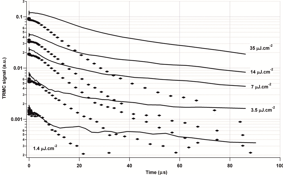 Figure 2. TRMC signals induced by 532 nm laser pulses (10 ns FWHM) in pieces of a p-Si wafer covered at one side with Al2O3 deposited by spin coating (diamonds) and by spray pyrolysis (line) in a semi logarithmic representation. The samples are illuminated at the Al2O3 covered side with laser intensities as indicated in the figure.
