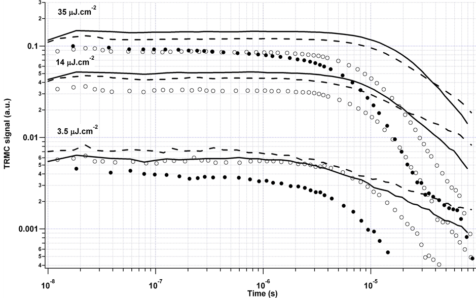Figure 3. TRMC signals induced by 532 nm laser pulses (10 ns FWHM) in pieces of a p-Si wafer covered at one side with Al2O3 deposited by spin coating (hollow circles before annealing―filled circles after annealing) and by ILGAR (dashed lines before annealing―line after annealing) in a double logarithmic representation. Annealing was performed 10 minutes at 425˚C. The samples are illuminated at the Al2O3 covered side with laser intensities as indicated in the figure.