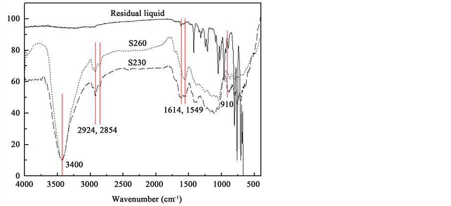 the FTIR spectra of the raw residual liquid, S230 and S260. Compared to the raw residual liquid, the carbonaceous products exhibited significant different absorption bands.