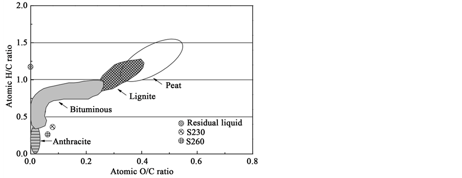 Figure 4 indicates the classification of the carbonaceous product as a solid fuel based upon Van Krevelen diagram [19] . For comparison, H/C vs. O/C atomic ratios of the residual liquid, anthracite, bituminous, lignite, and peat were also plotted in the Van Krevelen diagram. S230 and S260 were approaching the region of anthracite and bituminous respectively, implying that their element compositions were similar to anthracite and bituminous, respectively.