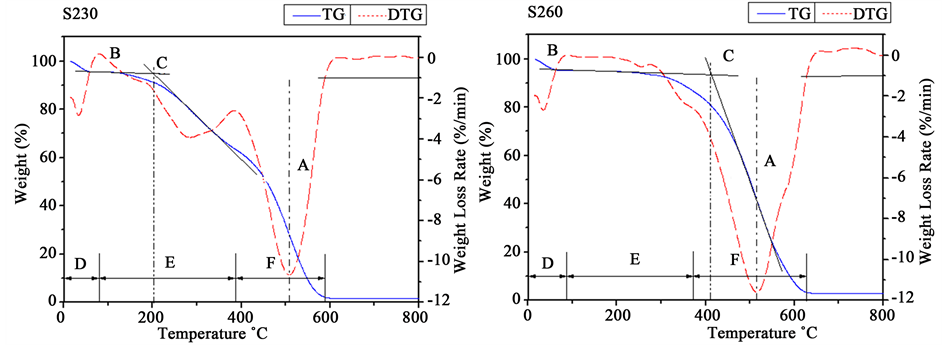 S230 had a distinct peak, which was due to the loss of high VM of S230. But S260 did not have the stage F of S230 and S260 products took place in the temperature range of 385˚C - 588˚C and 371˚C - 628˚C for the further release of VM and char combustion, respectively [22] [23] .