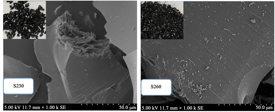 Figure 2 shows the surface morphologies of the carbonaceous products with different carbonization temperatures. It was seen in Figure 2 that the morphology of the two samples were dense massive structure without poresor pathways. However, some parts of S230 exhibited fibrous and flaky structures and these structures disappeared at higher temperature as showed in the image of S260. Some lines were found on the surface of the two samples and implied that the carbonaceous product formed layer by layer.