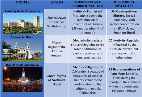 The tactic is existential. Therefore, vectorial logic allowed us to treat the national/regional and reticular moving scales as associative spatial ways: Where and how does an expressed Marian devotion establish a territory of cultural diversity? With investigation projects underway with regard to devotional irradiation, looking to display the unequal coverage of the invocation of the Immaculate Conceição Aparecida on a national scale, we look to two other Marian ways that can represent the two other scales. By this means, and in summary, we reached the following syntax board of this Brazilian projection of the three models (Figure 1), and from them, opened up ways to comprehend the potentiality of the time-space and symbolic formation of what will be approached in the next item: the shrine-municipalities.