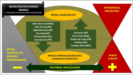 To simplify, in order to comprehend such forces as shrine molders in a measurable spatial segment―here called a municipality-shrine―we will re-name the vectors according to their main derivative. The first is manifested by Ritualization. The second by Mediatization; and the third by Visitation. Therefore, the “ritualizing” festivity, the “mediatizing” advertising, and the “visiting” tourism represent, in this study, three communicational (and geo-educational) energies of the establishment of the symbolic space of shrine municipalities. The examples in this project directly emerge from the studies performed, with the group of municipalities devoted to the invocation of Conceição Aparecida, whose diocesan hierarchy transformed into regional shrines, thus defying the sometimes collaborative and sometimes competitive action of the three vectors.