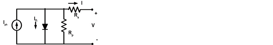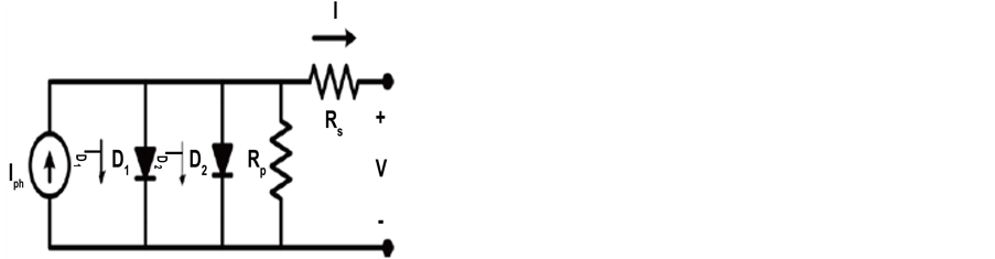 Single diode model is the simplest as it has a current source in parallel to a diode. This model is upgraded by the inclusion of one series resistance, Rs [9] - [13] . In spite of its simplicity, it exhibits acute deficiencies when suffered from temperature deviations. An accretion of the model which introduces a supplementary shunt resistance Rp [14] - [18] exhibited in Figure 1. Although momentous development is attained, this approach claims significant computing exertion. Moreover its precision declines at low irradiance, particularly in the vicinity of open circuit voltage (Voc). Two-diode model (consisting Rp and Rs) shown in Figure 2 is recommended for improved accuracy [19] .