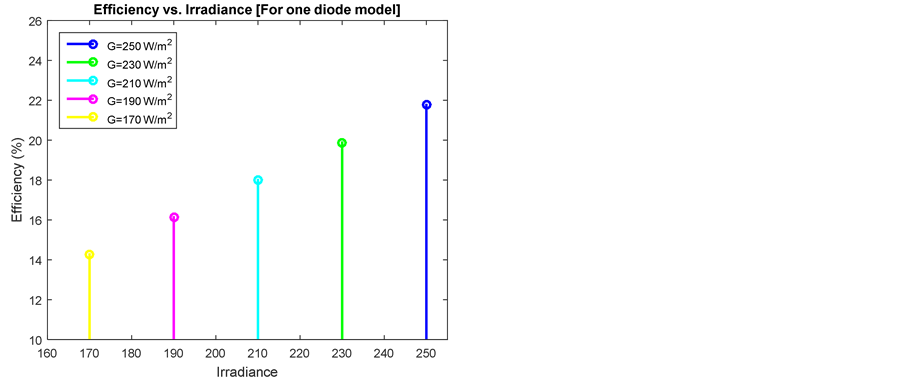 As demonstrate in Figure 3(b) and Figure 4(b), an increase in solar irradiance causes the power curves to move upward. Along with this, Table 2 demonstrates that maximum power and efficiency are increased at a significant amount with increasing value of solar irradiance for both models of PV cell. When irradiance is 170 watt/m2, efficiency of two diode models is 2.4% higher than one diode model. Consequently when irradiance is 250 watt/m2, efficiency of two diode models is 3.4% higher than one diode model. Hence Table 2 clearly shows that two diode models provide better efficiency.