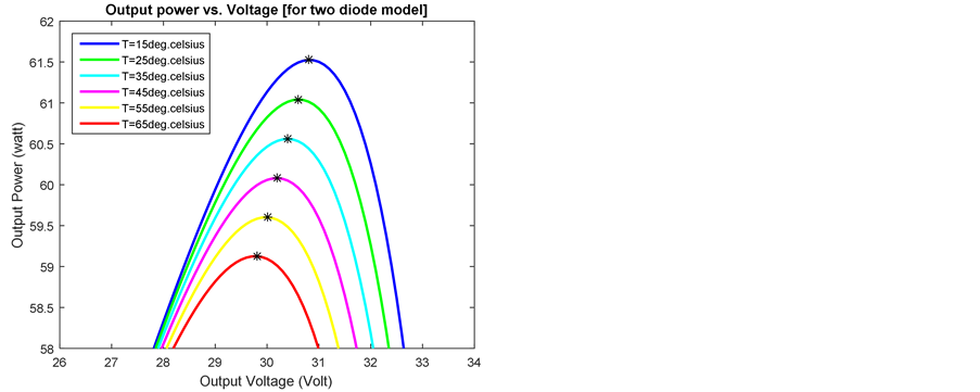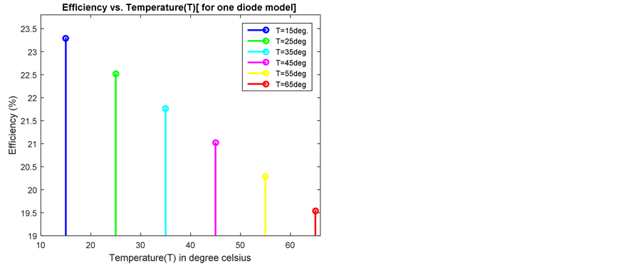 Diode’s built-in potential is relevant with the conducting voltage of a solar cell. As a solar cell gets hot, the voltage is reduced, and therefore the output power and efficiency both are reduced. Thus the performance of solar cells decreases at high temperatures. Figure 5(b) and Figure 6(b) clearly illustrate this fact for simulated mathematical models [41] .
