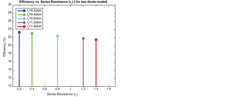 Inspecting Figure 9 and Figure 10, it is detected that maximum Power as well as cell efficiency reduced with increasing value of series resistance for both models. Therefore, Table 5 presents that, double diode model furnish better performance for changing values of series resistance.