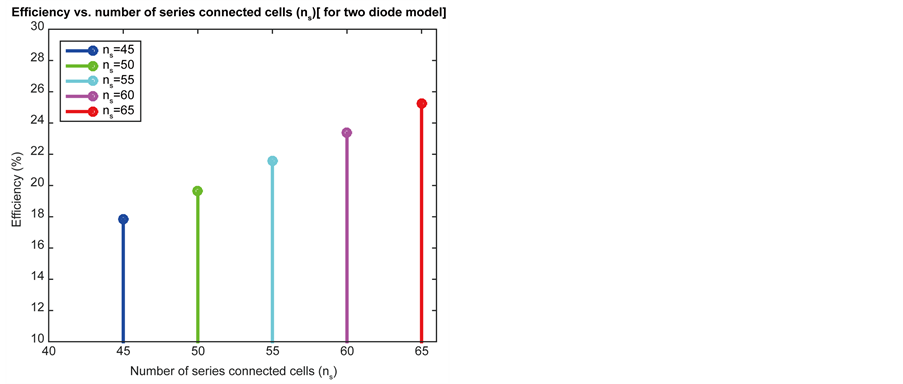 Series connections increase output power because voltage output is increased whereas output current remains almost constant. Figure 11 and Figure 12 clearly justify this fact. Efficiency of solar panel is increased with increasing number of series connected cells. For different values of series connected cell, double diode model serve with higher efficiency than single diode model. This evaluation is clearly exhibited in Table 6.