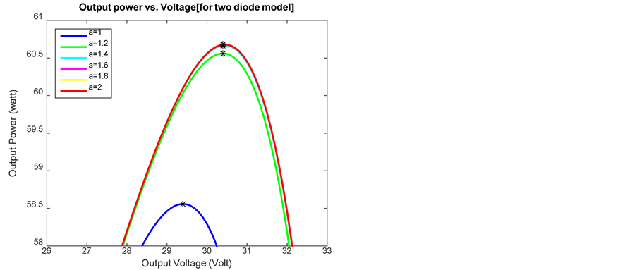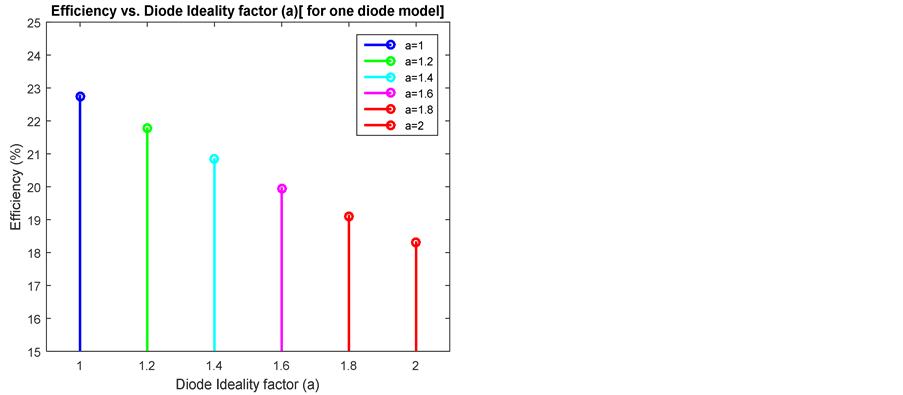 Diode ideality factors a1 and a2 respectively represent the diffusion and recombination current components for a double diode model. In accordance with Shockley’s diffusion theory, the diffusion current, a1 must be unity [49] . Nevertheless, the value of a2 is malleable. Figure 16 describes that, Pmax and efficiency are almost constant after a2 reaches the value of (1.2). Hence this will be the appropriate ideality actor for diode (D2) to have maximum cell efficiency. Table 8 validates theoretical recognitions for both models regarding diode ideality factor.