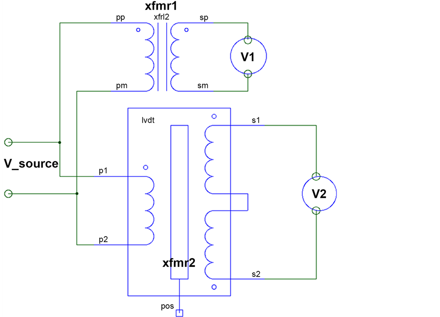 Transformers xfmr1 and xfmr2 are both connected in parallel and are supplied by voltages Vsource. Transformer xfmr1 is the transformer under taste. Transformer xfmr2 has a known variable turns ratio.