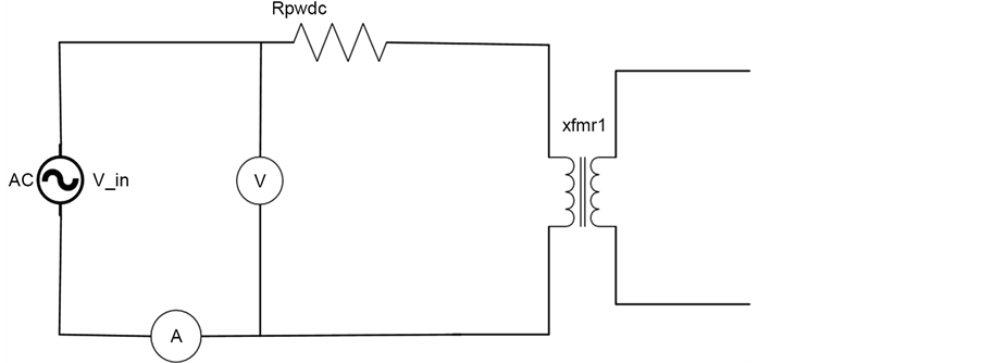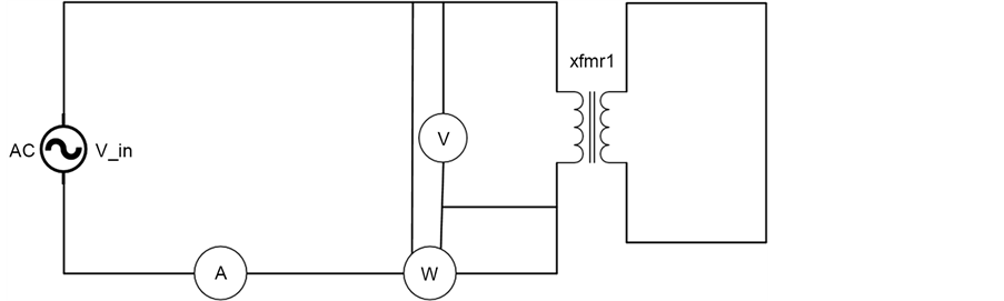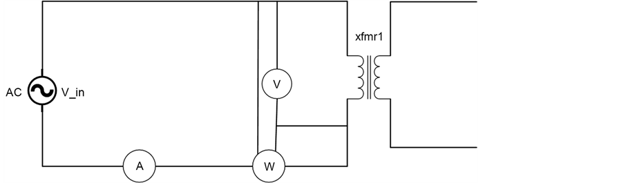 In the circuit diagram, xfmr1 is the transformer under test, A is ammeter, W is wattmeter with both current and voltage probes connected to the circuit to measure active power, V is the voltmeter.