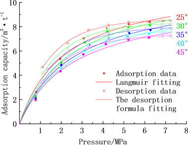 Samples were collected at site and balanced water experiments were carried out on the samples. After the sample preparation was completed, the methane adsorption/desorption experiments were carried out. Experiments were carried out by using AST-2000 type CBM adsorption/desorption experimental instrument, five experimental temperature points were set at 25˚C, 30˚C, 35˚C, 40˚C, 45˚C. The isothermal adsorption experiment is a repetitive process of prelum- equilibrium-prelum, and the isothermal desorption experiment is a repetitive process of depressurization-equilibrium-depressurization. Experimental equipment automatically collects the pressure, temperature and other experimental data.