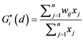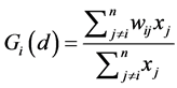 where d is the neighborhood (threshold) distance, and wij is the weight matrix that has only 1.0 or 0.0 values, 1.0 if j is within d distance of i, and 0.0 if its beyond that distance. These formulae indicate that the cross-product of the value of X at location i and at another location j is weighted by a distance weight, wij which is defined by either a 1.0 if the two locations are equal to or closer than a threshold distance, d, or a 0.0 otherwise. The G statistic can vary between 0.0 and 1.0. The statistical significance of the local autocorrelation between each point and its neighbors is assessed by the z-score test and the p-value. ArcGIS uses the following formulae to calculate the local Getis-Ord