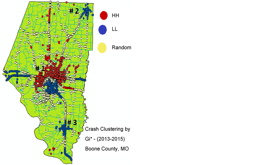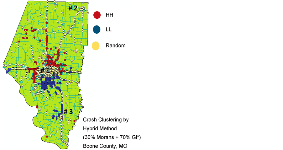statistic to measure the spatial autocorrelation of vehicle crashes occurred in Boone County roads in the state of Missouri, USA for the years 2013-2015. Since each index can identify different clustering patterns of crashes, therefore this paper introduces a new hybrid method to identify the crash clustering patterns by combining both Moran’s Index and