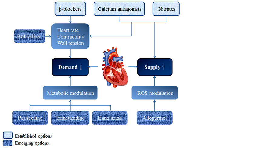 This review addresses the evolving role of a number of newly recognised/developed anti-anginal agents in the setting of “difficult” angina pectoris. The major sites of action of these agents in ameliorating ischaemia are schematized in Figure 1. A potential role for all of these agents in angina pectoris refractory or unsuitable for β-blockers or calcium antagonists was also included in current textbook recommendations [7] .
