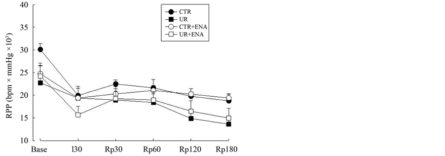 Figure 1. Time course of changes in rate-pressure product (RPP) during the experimental protocol in control (CTR), uremic (UR), CTR + ENA and UR + ENA rabbits. Data are expressed as means ± SEM; *p ≤ 0.05 versus baseline values in respective experimental groups.