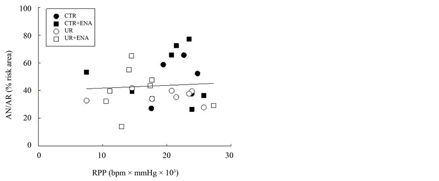 Figure 2. Scattergram showing relation between area of necrosis (AN) as a percentage of area at risk (AR) and rate-pressure product (RPP) for CTR, UR, CTR + ENA and UR + ENA groups. Smaller infarcts were not a result of lower myocardial oxygen demand.