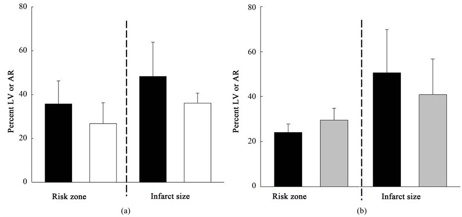 Analysis of infarct size and risk zone: At the end of the study, under deep anesthesia, each animal was sacrificed by intravenous injection of saturated potassium chloride (10 mL). Risk zone size was demarcated after re-ligation of the infarct-related artery by intra-atrial injection of Monastral blue dye (5% solution); the heart was then extirpated, placed on a Langendorff perfusion apparatus and perfused with 2,3,5-triphenyltetrazolium chloride (at 75 mmHg and 37˚C). After 20-min the right atria and right ventricle were dissected and discarded, the LV was weighed and fixed by immersion in buffered 10% formalin. Coronary collateral blood flow within the risk region was not assessed since it is minimal in rabbit myocardium [10] . Risk zone, infarct zone and total LV area were measured and calculated as previously described [26] .