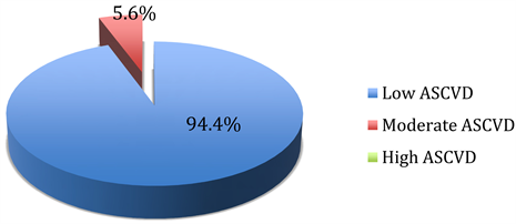 A short (10-year) ASCVD risk estimate was generated and vascular heart age was calculated using recommended Framingham Heart Study chart, a risk prediction model assigning weight (points) to traditional risk factors for ASCVD such as age, total cholesterol (mg/dL), HDL-cholesterol (mg/dL), treated or untreated SBP (yes or no), smoking status (yes or no), and T2DM (yes or no) [13] . Likewise, the mentioned variables have not been accounted in our multivariate stepwise model. ASCVD risk estimate was considered as low (≤6%), moderate (between 6% and 9%), or high (≥10%) [14] . Heart age/vascular has been classified as less than 40 years, between 40 and 49 years, between 50 and 59 years, and 60 years or higher.