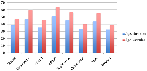 Overall, the average aircrew vascular age was older than the chronological one. Moreover, the average vascular age of flight crew (56.85 ± 16.6y), pilots at ≥5000 flight hours (64.1 ± 13.6y), males (55.8 ± 16.6), Caucasians (59.9 ± 16.0y) was higher when compared to their counterparts (Figure 2).