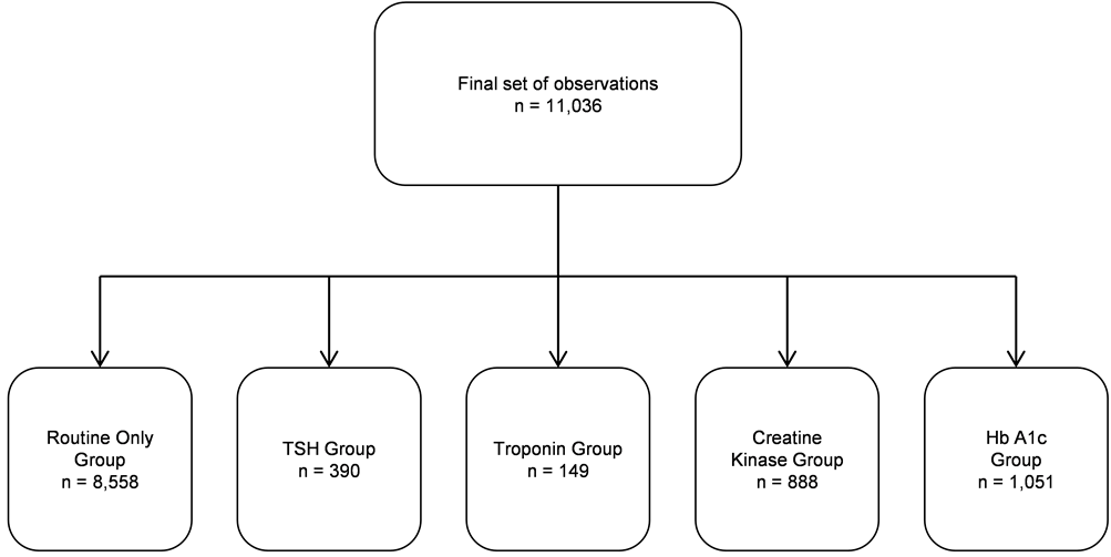 For the Lab Drawing Analysis, the final population was split into five separate groups based on which one (or none) of the four non-routine labs the patient had drawn: routine labs only, routine labs plus TSH (the “TSH group”), routine labs plus Troponin, routine labs plus Creatine Kinase, and routine labs plus Hb A1c. Because one of the criteria was to remove observations with more than one non-routine labs drawn, no patient fell into more than one of the above groups.