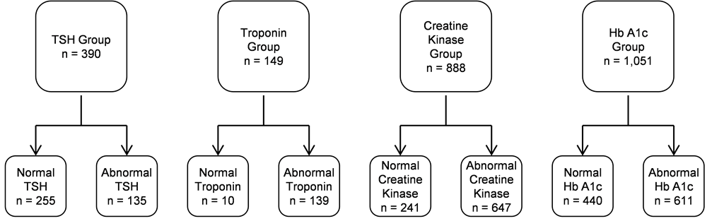Drawing a non-routine lab was associated with a statistically significant increase in mortality in the Troponin group but not in the TSH, Creatine Kinase, or Hb A1c groups. Additionally, an abnormal TSH value was associated with a statistically significant increase in mortality but not an abnormal Troponin, Creatine Kinase, or Hb A1c, though clinical significance cannot be ruled out based on these results alone. The relatively smaller sample sizes in this study may contribute to the lack of statistically significant associations. For example, although a statistically significant result was not observed in the Troponin Group with a sample size of 149, Devereaux, et al. (2012) found a statistically significant association between a peak fourth-generation Troponin T value of at least 0.02 ng/mL and 30 day mortality in a study of 15,133 patients undergoing noncardiac surgery [6] .