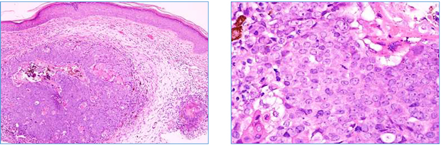 In conclusion, MMM is a very rare tumor but with characteristic cytological and architectural features. Recurrence and metastasis are two definite criteria for malignancy. Multinodular infiltrative growth, tumor necrosis, and ulceration may suggest more aggressive behavior. In contrasts to previous reports, it appears that an increased number of mitoses are not a reliable predictor of behavior. Pathologists should be aware of this entity when dealing with a biphasic basaloid/melanocytic lesion to avoid misdiagnosis [8]. The clinical behavior of these tumors is yet to be fully elucidated, with very few cases reported and limited follow-up. Therefore, complete excision with clear margins and close follow-up of patients are recommended. Reporting of future cases, including clinical follow-up, will help delineate predictors of biological behavior in this tumor.