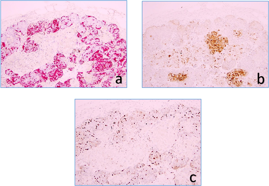 Figure 3. Melan-A stain (red) outlines melanocytes (a), cytokeratin AE1/AE3 stain (brown) outlines epithelial elements (b), and KI-67 stain (brown) detects proliferating cells (40×).