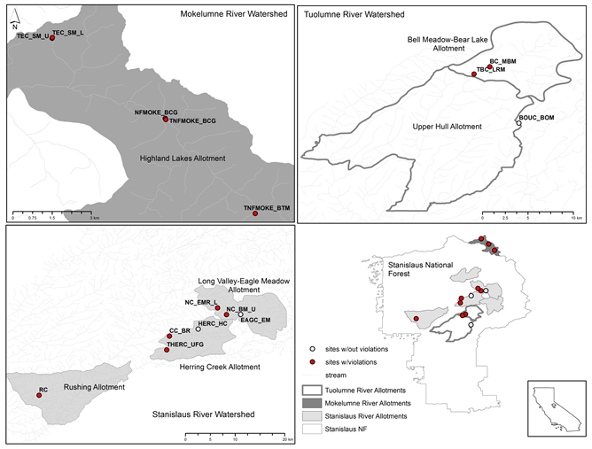 This study occurred exclusively within the Stanislaus National Forest (STF) located on the western slope of the central Sierra Nevada, California. The STF encompasses 898,000 acres and 800 miles of rivers and streams [22] . Seventy percent of lands on the STF (634,000 acres) are available for livestock within 36 grazing allotments [2] . In this study small perennial streams within three watersheds (the Mokelumne, Stanislaus, and Tuolumne Rivers) were sampled within 6 of the 36 allotments including Bell Meadow-Bear Lake, Long Valley-Eagle Meadow, Herring Creek, Highland Lakes, Rushing, and Upper Hull Allotment on the STF from 2012 through 2016 (Figure 1). See Table 1 and Table 2 for specific